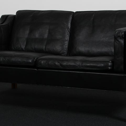 Børge Mogensen 1914-1972. Fritstående to-pers. sofa, original betrukket med sort anilin læder, løse dun polyhynder i sider, sæde og ryg, ben af eg . Fremstillet hos Fredericia Stolefabrik , model 2212. Formgivet 1963. H. 76/44. L. 160, D. 90 cm. Fremstår med minimale brugsspor. Matchende 3’er haves.