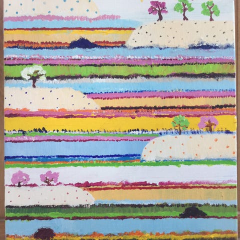 Koloristisk abstrakt landskab. Inspireret af den danske natur. Acryl på lærred. Måler 24cm x 30cm. Kunstner Eva Karin Thomsen.