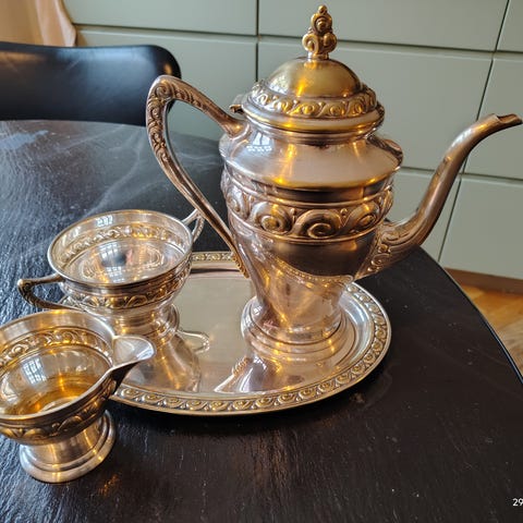 Sølv kaffekande, flødekande og sukkerskål med bakke.