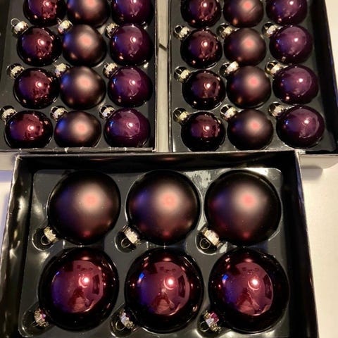 Jeg har til salg tre store juleglaskugler til at hænge på træet. Kuglerne er i smuk lilla farve med en dekoration af sne. Det er store glaskugler, som måler 7,5 i diameter.