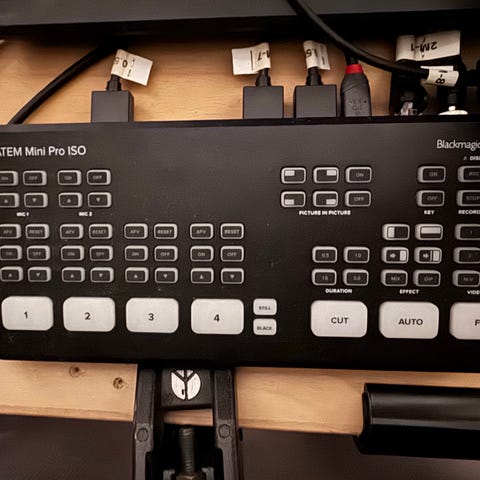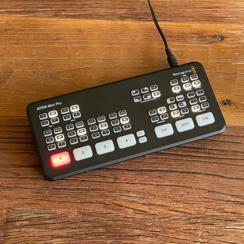 Blackmagic Design ATEM Mini Digital Videomixer med flere HDMI-indgange, knapper til skift mellem kilder, og USB-C forbindelse. Enheden er designet til live streaming og video produktion med funktioner til skift, overgange og billedbehandling.