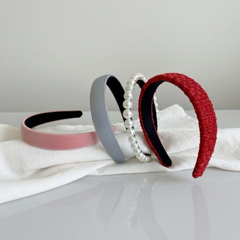 Sæt med 4 hårbøjler til kvinder i forskellige designs og farver. Inkluderer en sort hårbøjle med knude, en brun hårbøjle med små perler, en sort glitrende hårbøjle og en sort/hvid ternet hårbøjle. Materialerne varierer mellem stof og pyntede elementer. Velegnet til daglig brug og forskellige frisurer. Sælges samlet