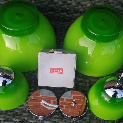 Super fin loftslampe med 3 store osram pærer, og røde stofledninger.