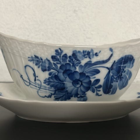 Royal Copenhagen Blå blomstsovseskål i porcelæn med hvid og blå farve. Skålen har et blomstermønster og inkluderer en underkop. Velegnet til servering af sovs eller saucer.