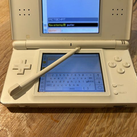Nintendo DS Hvid Nintendo DS Spillekonsol med dobbeltskærm, indbygget kamera og bærbar design. Enheden har en hvid yderside og er kompatibel med Nintendo DS spil.