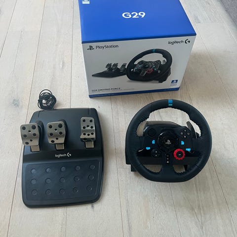 Logitech G29 racing wheel og pedaler til Playstation med sort farve og læderbelagt rat. Inkluderer rat, pedal sæt med tre pedaler og gearskifter. Designet til brug med Playstation konsoller og PC. Leverer præcis styring og realistisk køreoplevelse til racingspil.