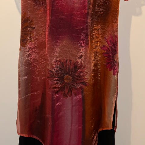 Rigtig pæn sort kjole med bådformet hals og ned i V på ryggen, samt 3/4 lange ærmer med slidser. Har blanke kantbånd i underkanten samt ved ærmer og ned langs forstykket. Har elastik i livet er derfor regulerbar og med et pænt bindebælte