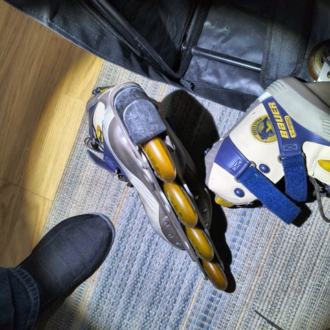 Sælges da nye er købt. Sidder godt på foden og kan formes efter egen fod via en hockey butik. Trænger til nye hjul, derfor den lave pris - kan dog godt fungere lidt endnu.