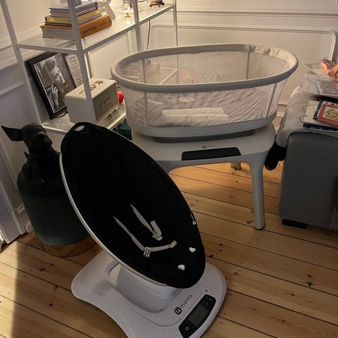 4moms Baby Swing i grå farve. Designet til børn med sikkerhedssele og justerbar siddeposition. Fremstillet af holdbare materialer med en base i hvid plast. Egnet til indendørs brug som et komfortabelt hvilested for børn.