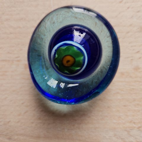 Glasfigurer, 2 stk, håndlavet med farvet glas. Hver figur har en unik form og farvevariation, monteret på en firkantet base. Egnet som dekorative genstande. Højde 31 cm
