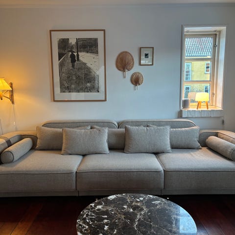Sofaen er i farven “sand”, stoffet “fabric” og er 230cm bred. Puder medfølger.