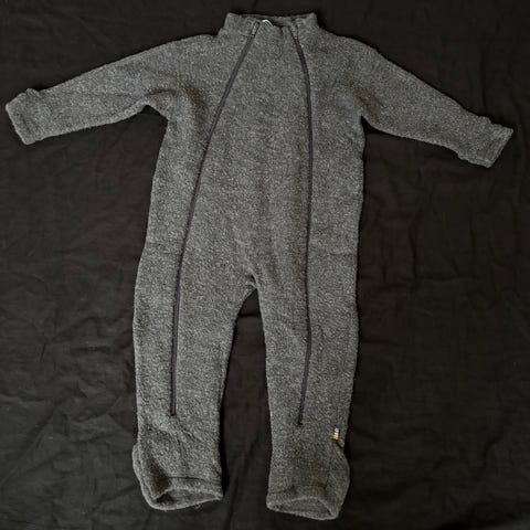 Nye pris 499kr. Dragten er lavet af merinould og har en lilla farve. Den har lynlås foran og ribkant ved ærmer og ben. Designet til at holde barnet varmt og komfortabelt.