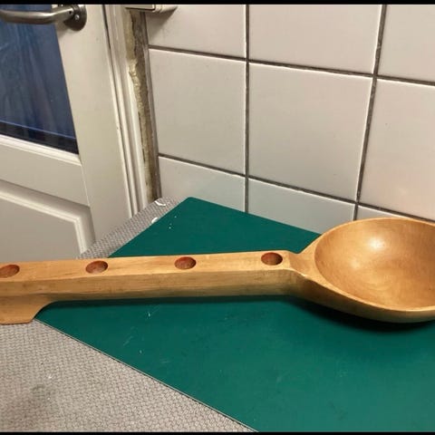 Håndskåret grydeske i træ 40,5 cm x 9cm. Til nissens julegrød f.eks. Vejer 110g.