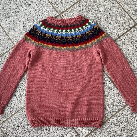 Ny, ubrugt håndstrikket trøje, i 100% superwash øko tex uld. Er strikket efter islandsk mønster. Passer til str. 12 år. Er fra røg- og dyrefrit hjem.