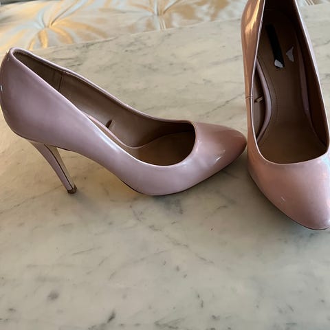 Zara højhælet sko i størrelse 40 med grøn farve. Skoene har en spids tå og slingback design. Materialet har en tekstureret overflade, der tilføjer et unikt udseende.