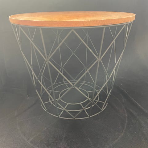 Rund Sofabord i træ og metal. Med mulighed for opbevaring. Bordpladen kan slibes.