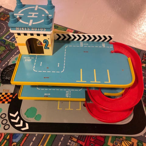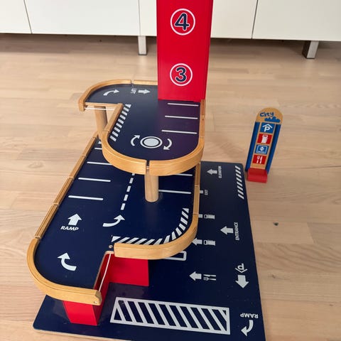 Stor flot træ parkeringshus med tankstation, bil elevator, bom, ramper og diverse vejbane stykker. Som den står på foto Måler den ca. 90 x 65 cm. Man kan selv bestemme hvor og hvordan vej bane stykkerne skal ligge. Der er mange muligheder. Den er købt hos den gamle skole på fyn, har nogle år på bagen, og er passet godt på. Fra Ikkeryger hjem, og har aldrig været opbevaret hverken på loft eller i kælder. Den store originale kasse haves. Kan skilles ad og sendes, men afhentning foretrækkes.
