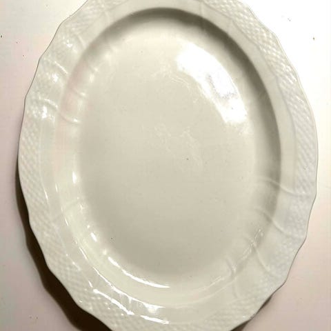 Ovalt Serveringsfad som måler 45 x 35 cm. Det har nummer 1235/1558. Guldkanten er fin og fadet er uden skader. Der er en lille brun plet i emaljen (se billede 3). Sender gerne hvis porto dækkes.