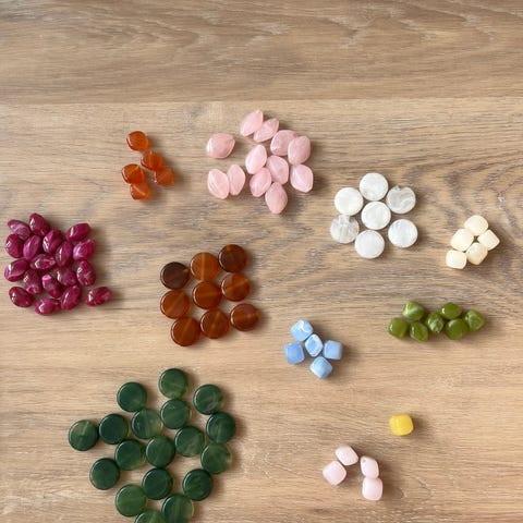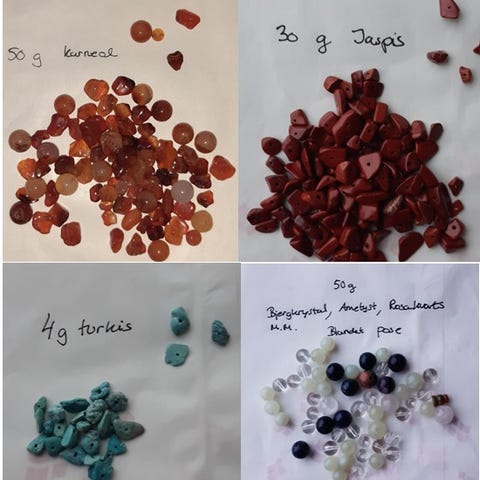 Smykkesten, 16 stk. / ca. 40 gr. Overskud fra en kæde, der er blevet ændret. Fra et røg- og dyrefrit hjem. Samlet pris 25 kr.