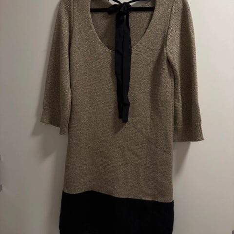 Guld strikket kjole, hulmønstret. Str m/l.