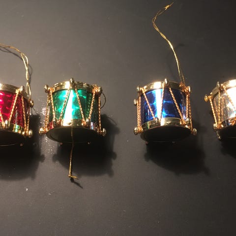 Kugler, trommer, pakker i grønt velour med guldtråd - ophæng - jul