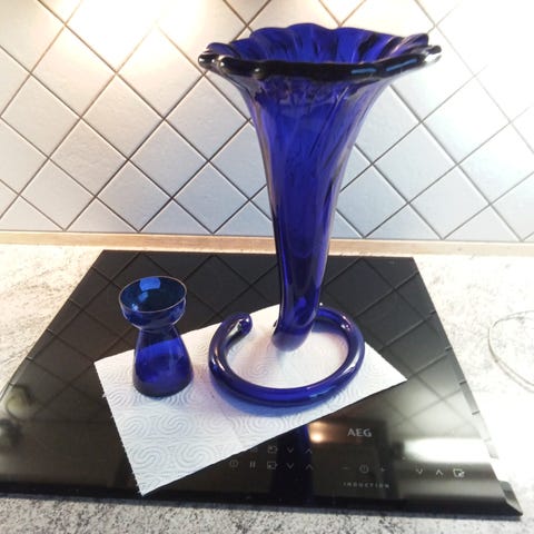 Liljevase med flotte blå, gul og hvide farver 38 cm lang.