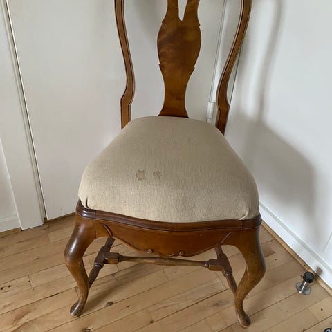 2 meget velholdte barok stole. Ingen pletter og slidtage på stof. Ens i “stof”. Den ene synes lidt mørkere i træet, men udsmykningen er ens. Farve forskel pga sollys. Sælges samlet. .Kom med bud