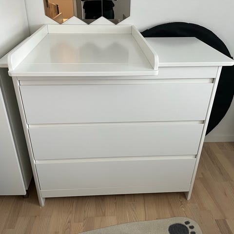 Kommoden er fint funktionel med tre store skuffer og en pusleplade der kan tages af.