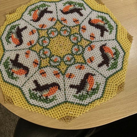 42 cm langt perlebroderi og 11 cm bred samt 3 lyskranse i perlearbejde. Sælges samlet til prisen