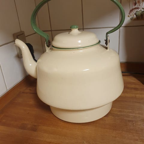 Tekno malet Vandkedel i orange farve, fremstillet af metal. Kanden har et rundt låg og en integreret hank for nem håndtering. Produktet viser brugsspor og mindre rust,