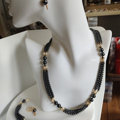 Fint sæt af armbånd og halskæde. Onyx og ferskvands kulturperler i en flot sammensætning.