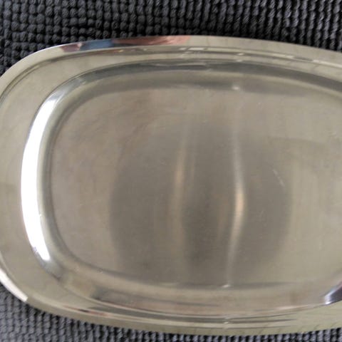 Stort serveringsfad fra Kalmar, Danmark. Det er lavet af 18/8 rustfrit stål med håndtag af teaktræ. Fin stand men selvfølgelig med ridser fra brug. Mål: 44x29 cm.