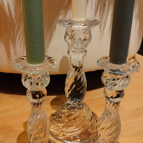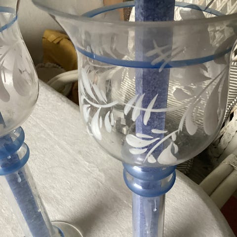 To franske blå lysestager i glas, formentlig fra 90erne. De er i virkelig flot stand uden afslag eller revner. Det rigtig fede ved lysestagerne er, at du kan bruge almindelige stearinlys, bloklys er fyrfadslys, for de passer alle!