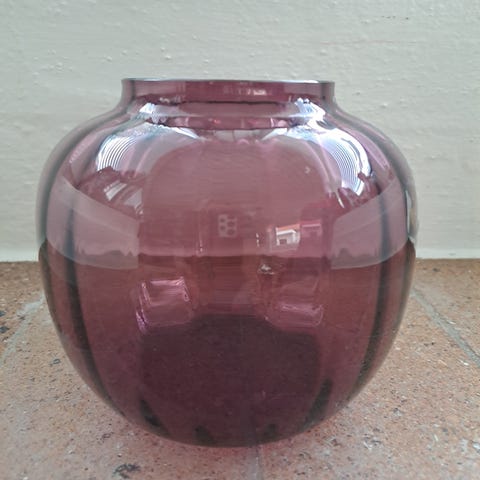 Knoglevase, orkidé vase, Holmegaard, glasvase, i auberginefarve, med klar glasbund, med bobler