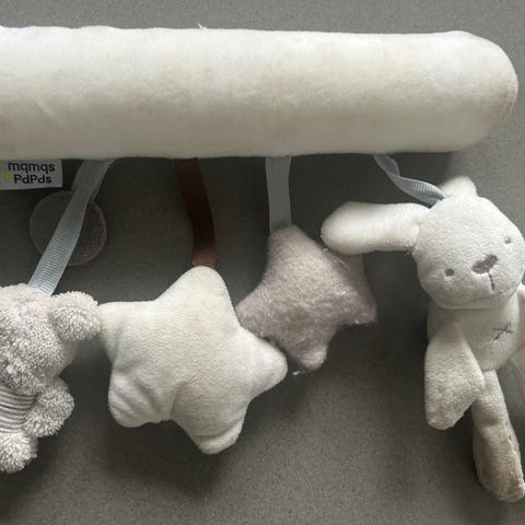 Design barnevognslegetøj sæt bestående af flere farverige og bløde figurer, herunder en sol og små dyr. Legetøjet er designet til at hænge på barnevogne og stimulere barnets sanser med forskellige former og teksturer.
