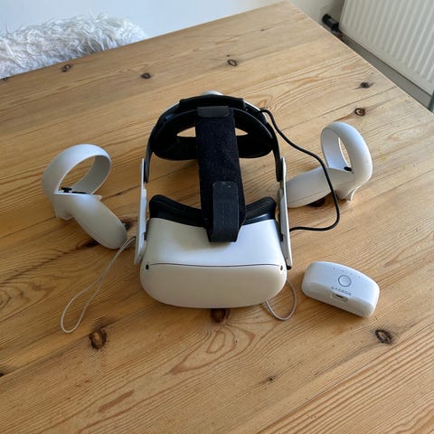 Oculus Quest 2 VR Headset i hvid farve. Inkluderer headset, to controllere og original emballage. Egnet til virtual reality spil og oplevelser. Produktet er beregnet til brugere af alle køn der mangler dog oplader men den bruger bare et normalt usbc stik