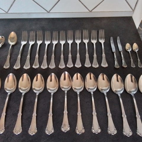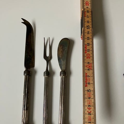 6 pålægsgafler 15 cm, 1 smørekniv 15 cm og 1 ostekniv 18 cm. Sølvplet