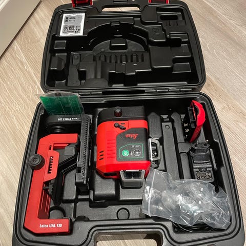 Sælger denne Leica Lino L2 linjelaser med vandret og lodret rød linje, selvnivellerende pris ide