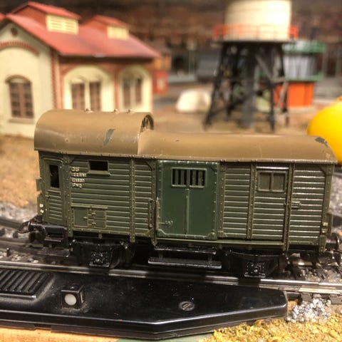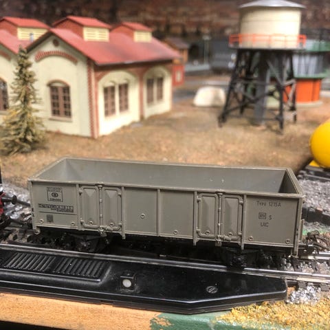 Modeltog godsvogn i brun farve med grå tag. Designet til modeljernbane med detaljeret ydre, egnet til samling og udstilling.