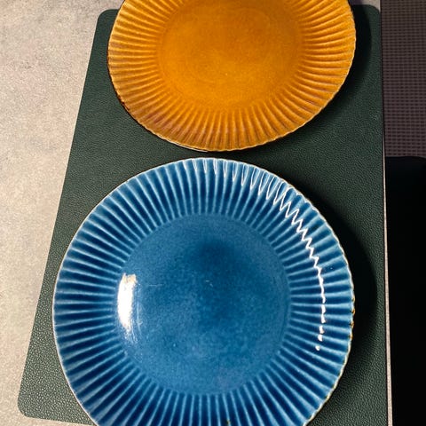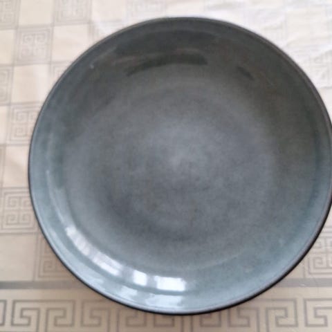 Flotte grøn/ grå håndlavet middagstallerkener der alle er unikke i farve og form.