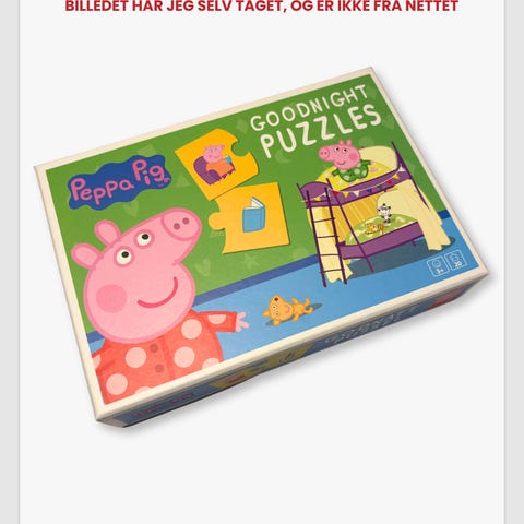 Peppa Pig Goodnight Puzzles er et børnepuslespil med forskellige motiver fra Peppa Pig-serien. Puslespillet indeholder store brikker, der er velegnede til små børn, og har farverige illustrationer med figurer og scener fra serien. Materialet er robust og designet til børnebrug.