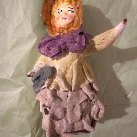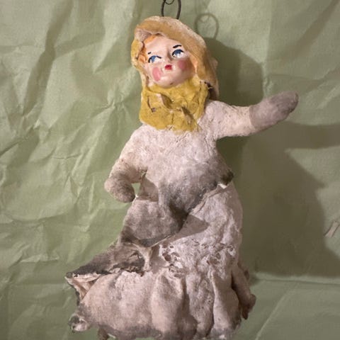 Flot gammel vatfigur af pige i flot kjole med muffe. Hun måler ca. 10 cm.