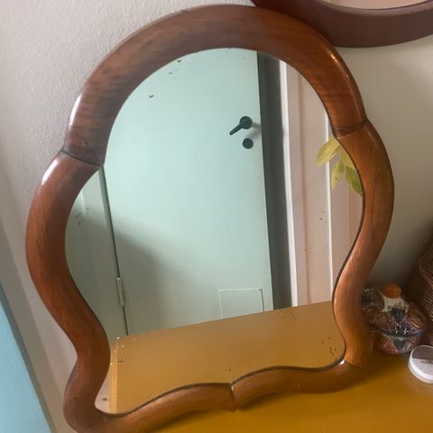 Antikt træspejl med integrerede hylder på hver side. Spejlet har en dekorativ ramme med udskæringer. Velegnet til ophængning i entré eller stue som funktionelt og dekorativt element.