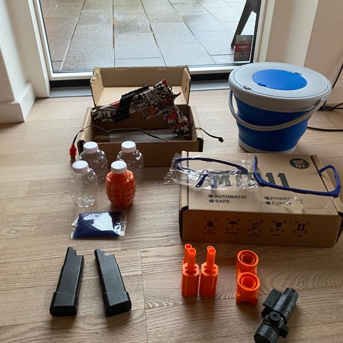 Hej sælger disse 2 store gel blazters gevær næsten helt nye kun brugt en gang imellem ingen synlig ridser eller noget ny pris 1000kr pr stk fra Bilka