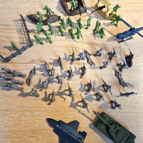 To militær actionfigurer med bevægelige led, iført uniformer i grøn og grå farve. Figurenes udstyr inkluderer hjelm, våben og taktisk udstyr. Fremstillet i plastikmateriale, velegnet til samling eller leg.