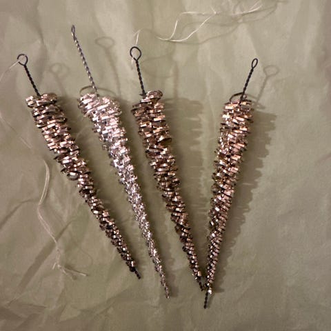 Smukke antikke drath (tinsel) stjerner til juletræet. Fra omkring 1920. De måler mellem 7 og 10 cm.