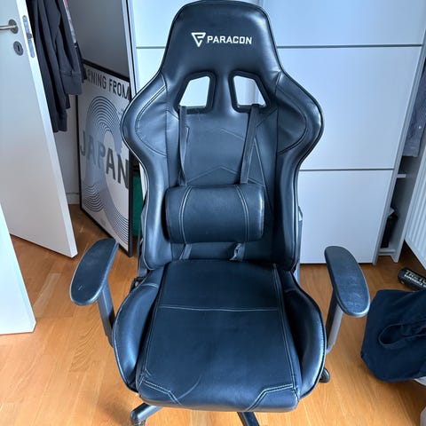 Gamingstolen har justerbare funktioner og polstret sæde for komfort, nakke- og lændestøtte.