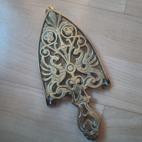 Antik strygejern med underplade/bordskåner. Underpladen er i dekorativ messing med mønster og kan bruges som bordskåner. Længde 28cm, bredde 14cm, højde 2cm, vægt ca 0,5kg