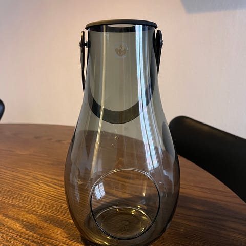 Holmegaard glaslanterne med klart glas og læderhåndtag. Lanternen er 25cm høj. Ingen fejl og står som ny.