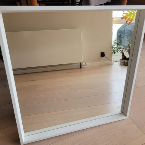 IKEA NISSEDAL væg spejl med hvid ramme. Spejlet har en firkantet form og er designet til at blive monteret på væggen. Materialet er holdbart og nemt at rengøre, hvilket gør det velegnet til brug i forskellige rum som entré, badeværelse eller soveværelse. 65x65cm.